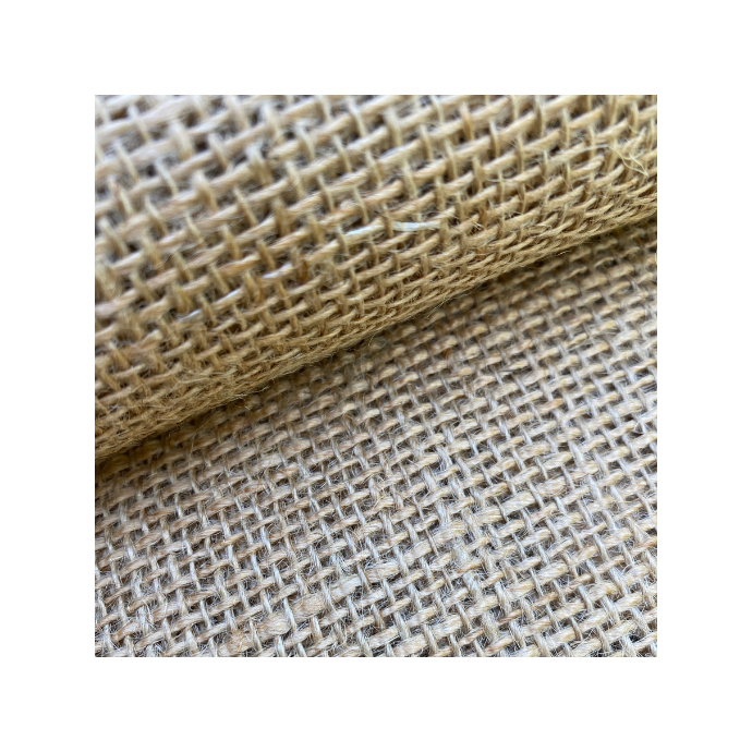 Odolná jutová tkanina v béžové barvě. Tkanina je pevná, odolná proti roztržení a oděru a používá se v několika průmyslových odvětvích. Textura tkaniny je hrubá s průsvitnou vazbou.