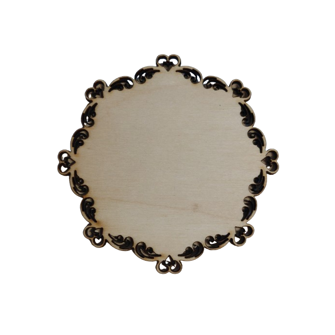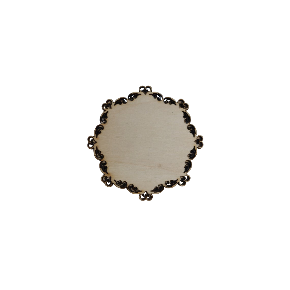 Ympyrän muotoisen virkkauskorin pohja helpottaa muotoillun kuvion saamista. Mitat: Halkaisija 100mm Verkon halkaisija: 10mm Paksuus: 3mm Materiaali: luonnonvärinen koivuvaneri. Hinta koskee yhtä kappaletta.