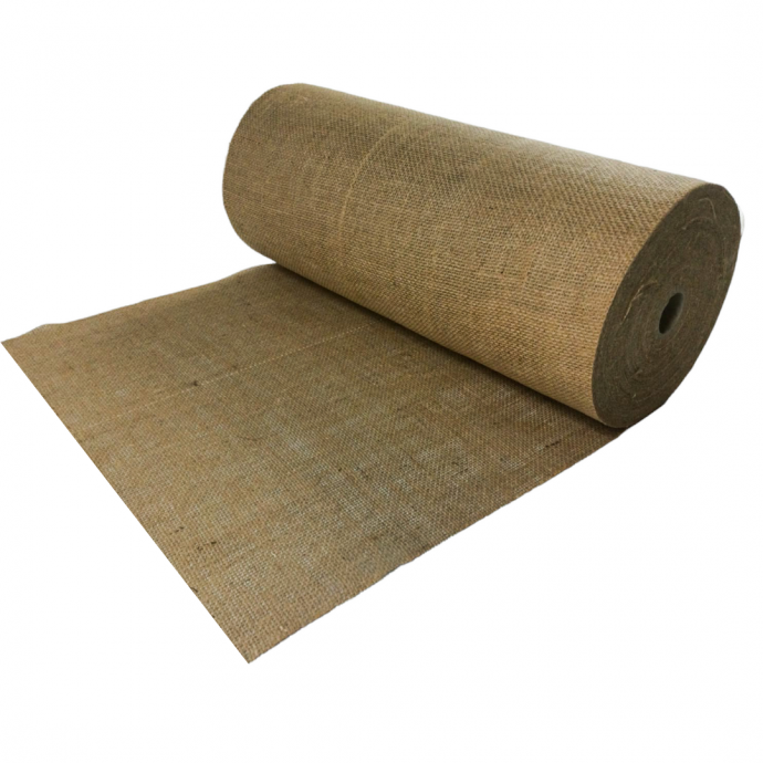 Tissu de jute durable, en beige. Ce tissu est solide, résistant aux déchirures et à l'abrasion et est utilisé dans plusieurs industries. La texture du tissu est rugueuse avec un tissage translucide.