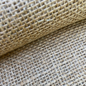 Durable jute fabric, beige in color. The fabric is strong, resistant to tearing and abrasion, and is used in several industries. The texture of the fabric is rough with a translucent weave.